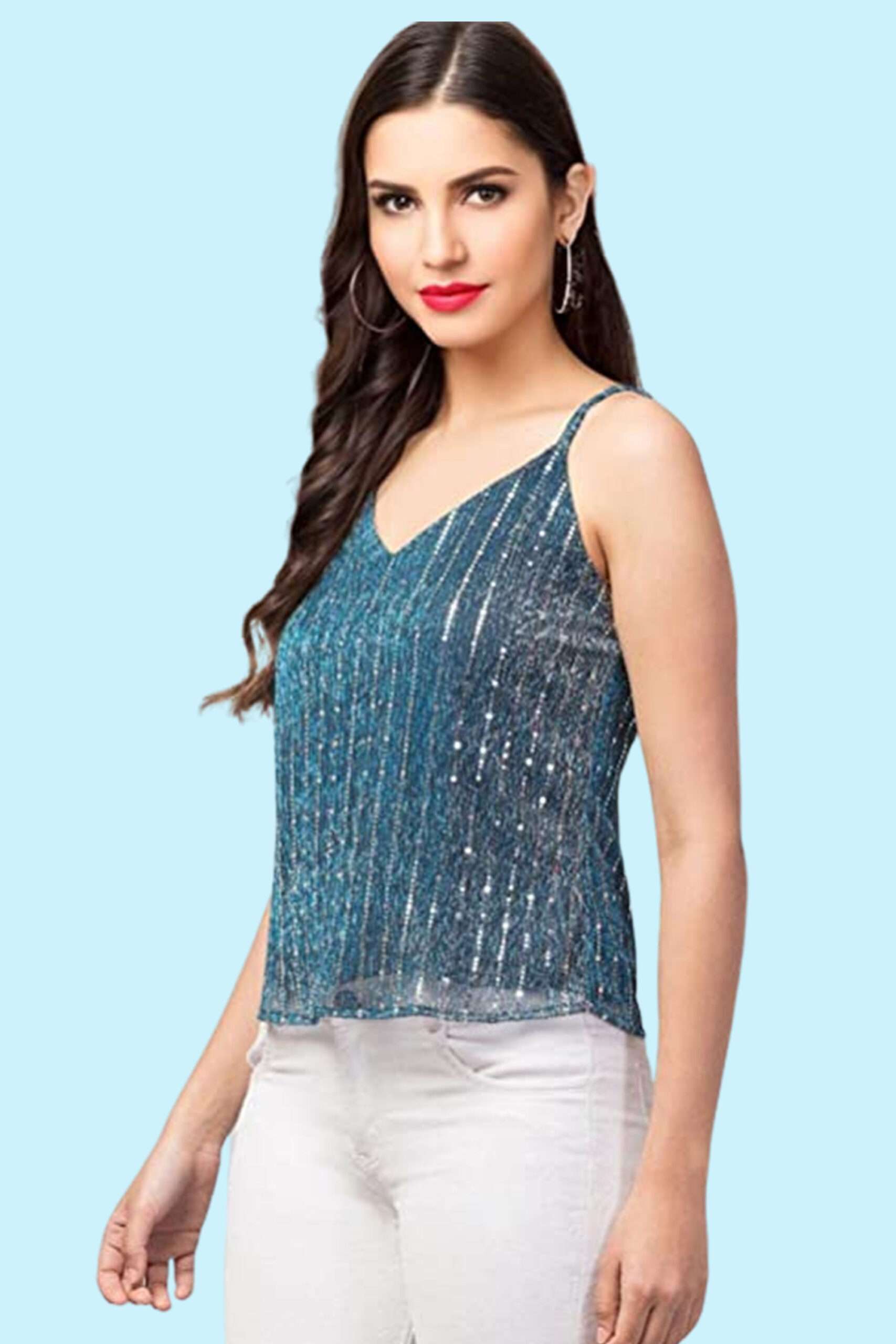 Thin Straps Sling Sparkling Tank Top Comfortable Crop Top (Blue)